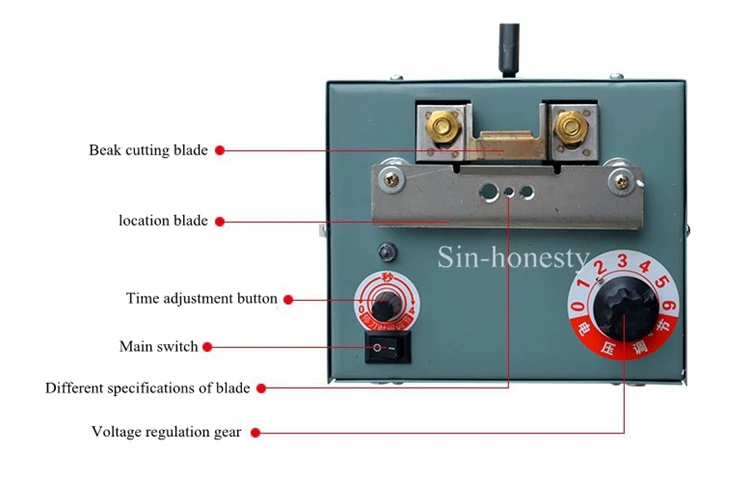 This chicken beak cutting machine use low-speed motor to drive electric heatng movable knife to do the up -and -down movement by chain bar driving part, and it can automatically set the knife with micro-moving chicken beak positioning blade to quickly finish cutting beak and stanch boold. The complete machine is composed of transformer, motor and cooling exhaust fan. The machine head is equipped with motor starting boat-shaped switch and voltage-adjusting multi-stage switch of electric heating movable knife. In addition, bench electric beak cutter has the electronic circuit of automatic stopping knife and stanchingblood, the machine head is equipped with time adjusting button of stopping knife and stanching blood; It can be adjusted randomly within 0-4 seconds.